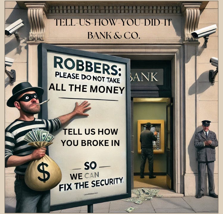 Imagine this scenario: a burglar breaks into your home and steals your belongings. But instead of being treated as the criminal they are, they leave you a note: "Your locks are terrible. Pay me for discovering this or hire me to fix them." Now, imagine the law starts to expect you to hang a sign on your front door inviting burglars to report what they find rather than ransack your house. Sounds ridiculous, right?